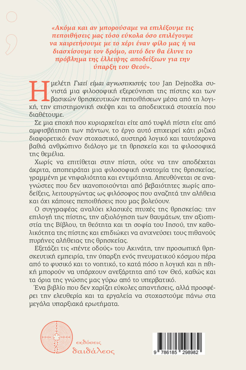 Η μελέτη Γιατί είμαι αγνωστικιστής του Jan Dejnožka συνιστά μια φιλοσοφική εξερεύνηση της πίστης και των βασικών θρησκευτικών πεποιθήσεων μέσα από τη λογική, την επιστημονική σκέψη και τα αποδεικτικά στοιχεία που διαθέτουμε.