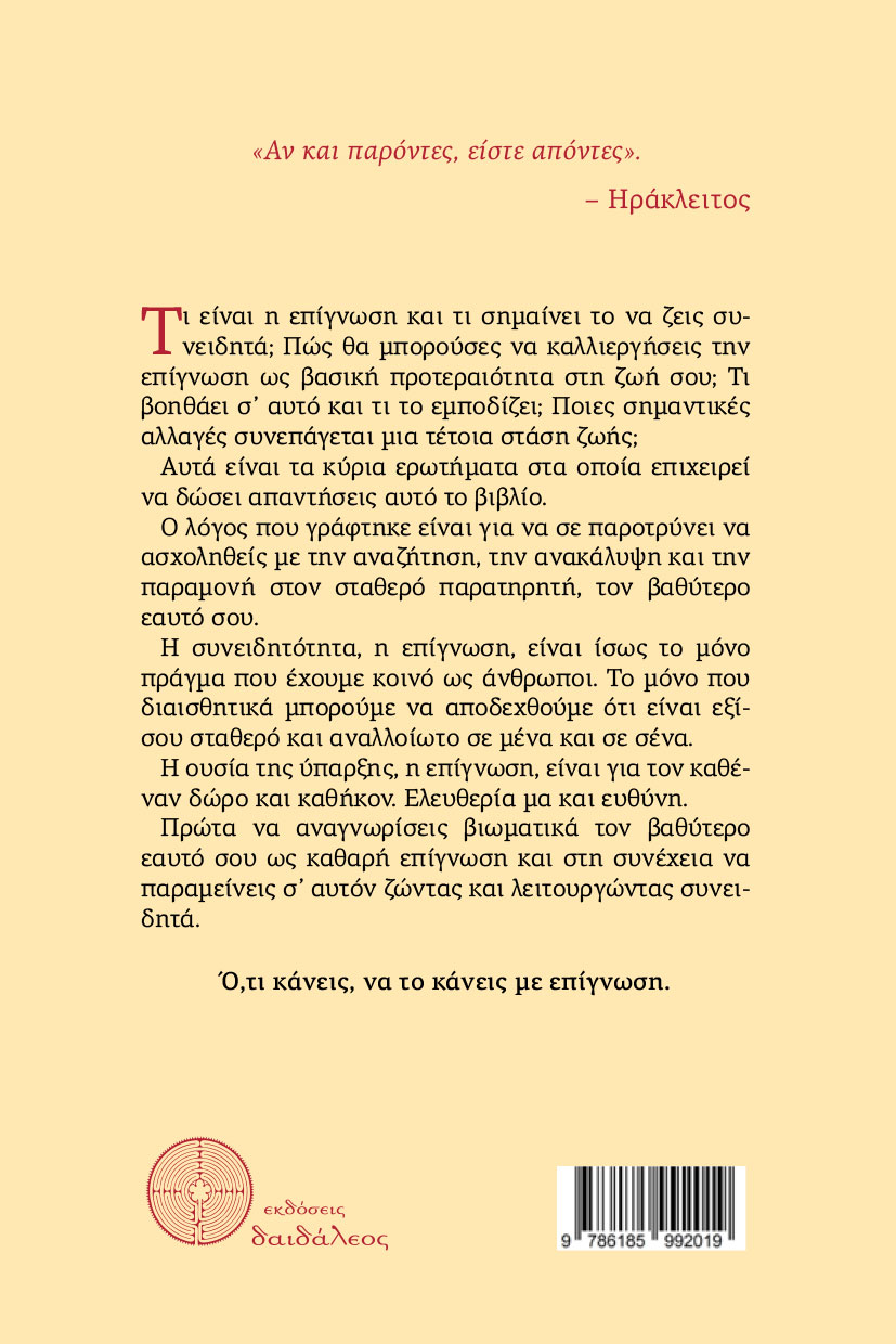 Τι είναι η επίγνωση και τι σηµαίνει το να ζεις συνειδητά; Πώς θα µπορούσες να καλλιεργήσεις την επίγνωση ως βασική προτεραιότητα στη ζωή σου; Τι βοηθάει σ’ αυτό και τι το εµποδίζει; Ποιες σηµαντικές αλλαγές συνεπάγεται µια τέτοια στάση ζωής;
